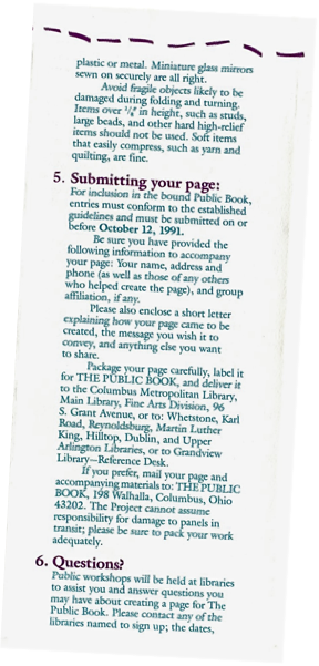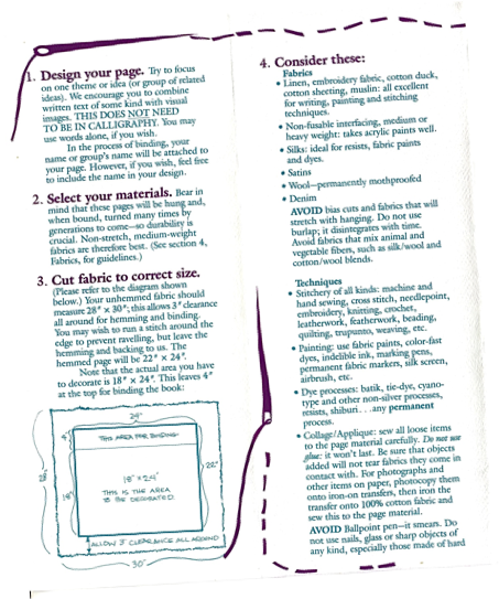In submitting pages, participants also furnished a one-page summary about the creation of their page, including who worked on it, its inspiration and meaning, and any other information that might interest readers generations hence. Information from these pages was condensed to create one-page display labels with mylar Braille overlays for the pages at exhibition.